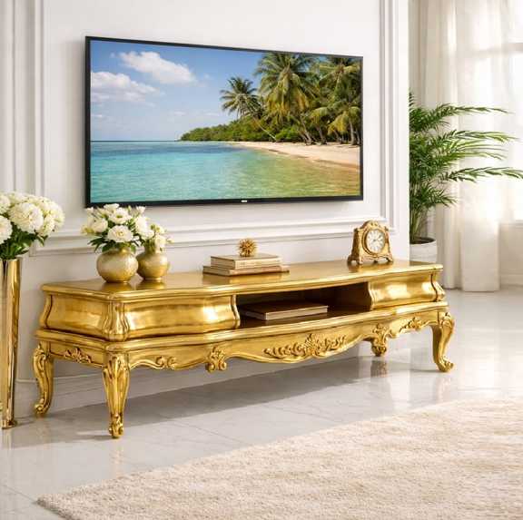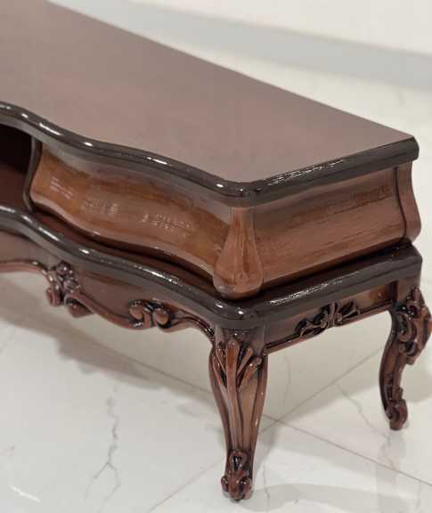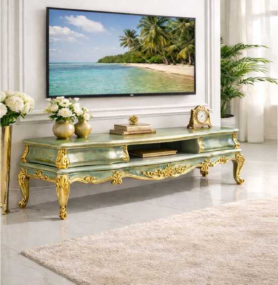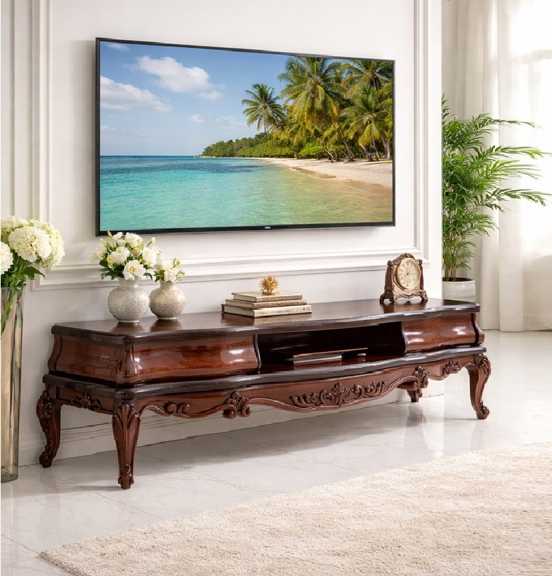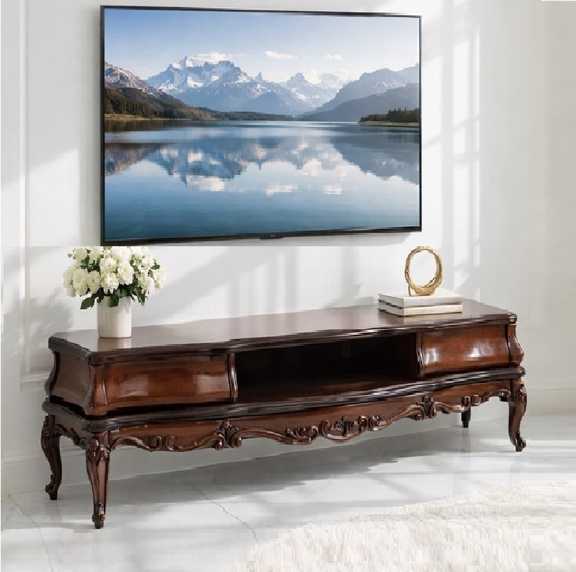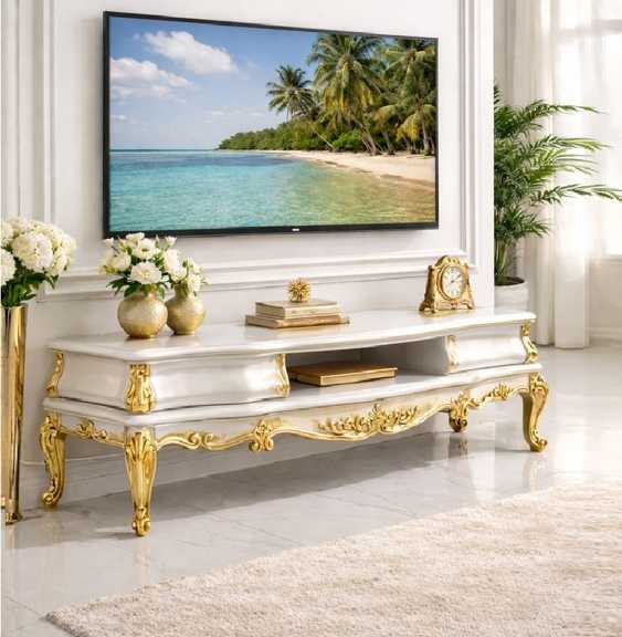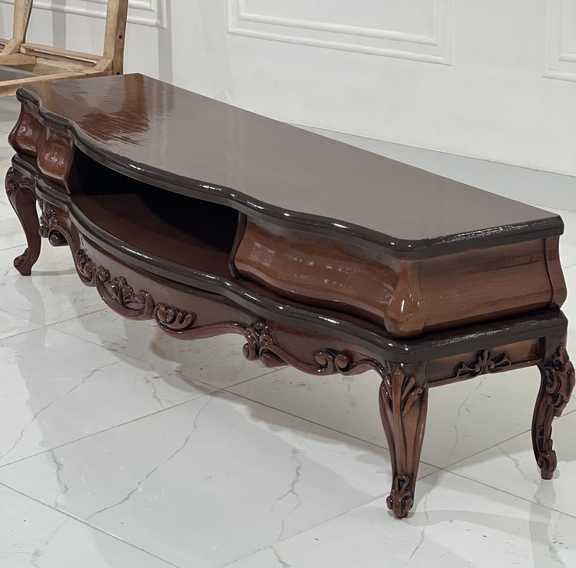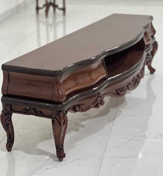 این میز تلویزیون با طراحی الهام‌گرفته از سبک‌های مبلمان کلاسیک اروپایی و هنر ظریف ایرانی، نه‌تنها یک وسیله کاربردی، بلکه یک عنصر دکوراتیو چشم‌نواز در فضای نشیمن شما محسوب می‌شود.